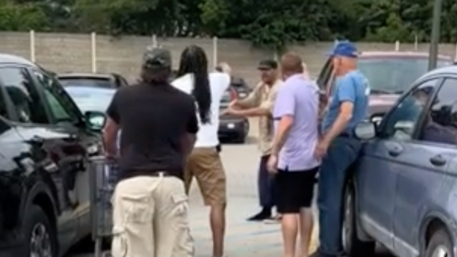 The scene unfolds in a parking lot outside the Traverse City store before an arrest.
